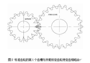 1、對所用標準齒輪的每個齒槽按順序依次用阿拉伯數字進行標記,并選定共軛標定齒輪的特定齒與標準齒輪的第1個齒槽進行徑向綜合測量嚙合,如圖2所示: