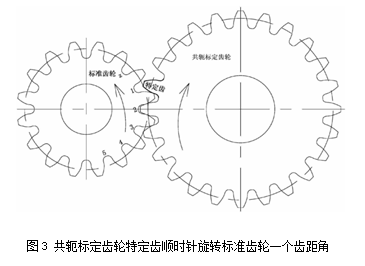 2、通過電機帶動共軛標定齒輪順時針旋轉標準齒輪的一個齒距角,如圖3所示,測量并采集兩個齒輪中心距誤差至計算機。