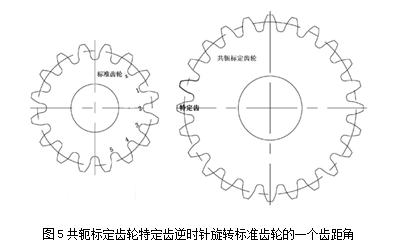 4、通過電機帶動共軛標定齒輪逆時針旋轉標準齒輪的一個齒距角,回到初始位置,對準標準齒輪的第2個齒槽,如圖5所示: