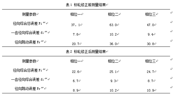被測齒輪在三個不同相位,標準齒輪修正前測量結果和修正后的測量結果如表1、表2所示: