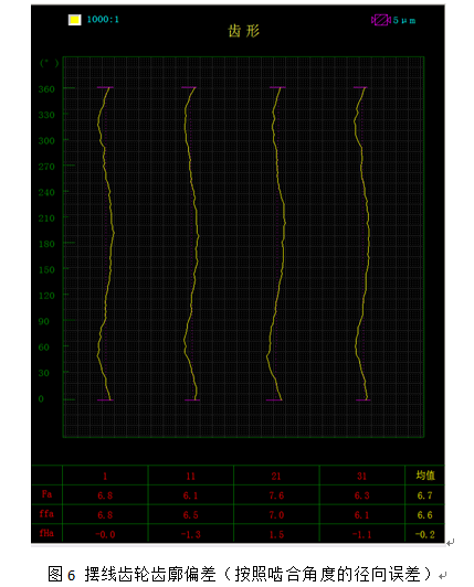以上第一種齒廓表達形式,在誤差曲線長度方向是擺線的等距嚙合角度,反應的是擺線齒輪的嚙合特性,而后一種齒廓表達形式,是轉化成直角坐標,清晰表達理論齒廓,設計齒廓及測量實際誤差曲線的關系,更緊密結合CAD數字化設計制造的評判。