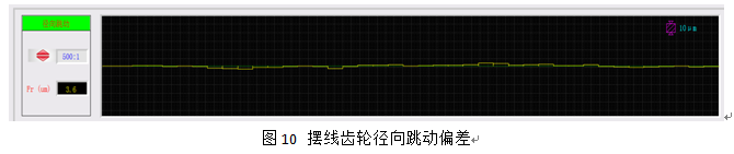 頂根距偏差和徑向跳動誤差由已經測量出擺線齒輪整周的數據,通過數據處理,可以得到全部頂根距誤差變動曲線和徑向跳動誤差變動曲線,測量偏差結果如圖9、10所示。