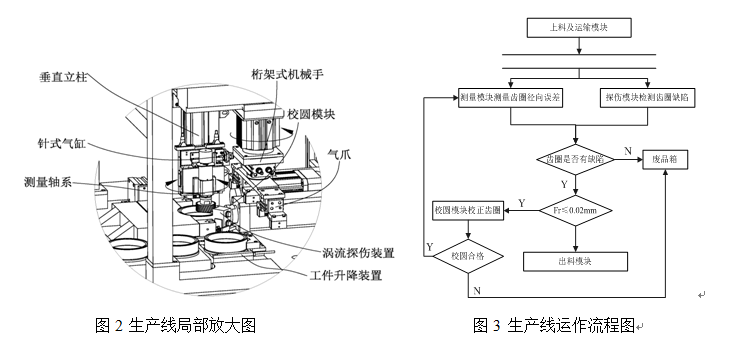 本項目的生產線是用于生產現場快速測量-校圓、探傷檢測、分選一體化的設備,該設備集合計算機多點控制、精密測量技術、傳感器、電動和氣動驅動、渦流探傷技術等多項先進技術,實現被測工件自動上下料、分度圓齒圈徑向跳動自動測量-校圓、探傷、分選及自動裝箱等功能。如圖1所示,儀器由上料及工件傳輸模塊、測量模塊-校圓模塊、探傷檢測模塊、出料模塊及控制單元組成。如圖2所示,桁架式機械手有2個氣爪,可實現沿X方向運動、Z方向運動及旋轉運動。測量模塊中測量軸系可實現Z方向運運和旋轉運動。校圓模塊伺服壓機可實現X方向運動。