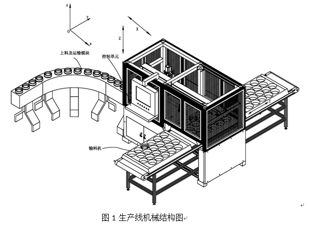 進料機構是一條平頂鏈式輸送機,其尾端有氣缸升降裝置;功能為輸送工件輸送至機械手抓取位置,通過升降裝置控制工件的高度,工件傳輸部分由直線模組、機械手等組成。