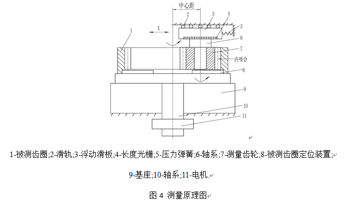 基于雙嚙合測量原理,采用標準齒輪修正技術,預先修正由于標準齒輪偏心所引起的誤差,利用計算機控制及誤差處理補償方法對測量結果進行修正。如圖4所示,首先將被測齒輪和測量齒輪安裝于固定基座和滑板上。電機帶動兩齒輪滾動,以被測齒輪回轉軸線為基準,用徑向拉力彈簧使被測齒輪與測量齒輪作無側隙的雙面嚙合傳動,被測齒輪的雙嚙偏差轉化為中心距的連續變動記錄成徑向綜合曲線。
