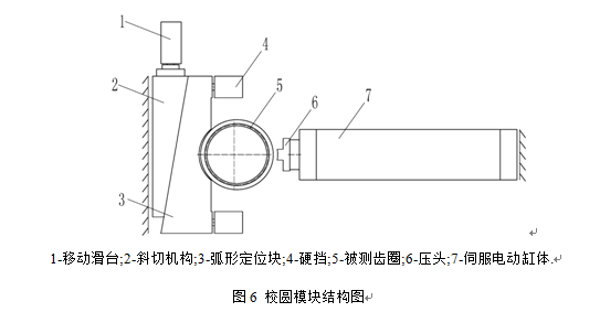 如圖6所示,校園部分主要由伺服壓機調直部分和弧形定位裝置等組成。伺服壓機調直系統主要由運動控制系統、折返式伺服電動缸、弧形定位裝置、位移顯示系統等組成。該模塊運動形式有伺服壓機的水平運動,軸系的旋轉運動。弧形定位裝置是由弧形定位塊、斜切機構、移動滑臺、推動氣缸組成,氣缸推動斜切機構向圖中所示方向移動,使弧形定位塊向與斜切運動方垂直的方向運動。通過弧形定位塊與硬擋的接觸來定位要調圓的齒圈,把齒圈高點旋轉至伺服壓力塊對應位置,計算機控制電動缸對齒圈施加壓力,標準齒輪帶動浮動滑板移動,當光柵讀數達到計算機設定時,電動缸停止施加壓力,恢復到初始位置,重復上述測量過程。